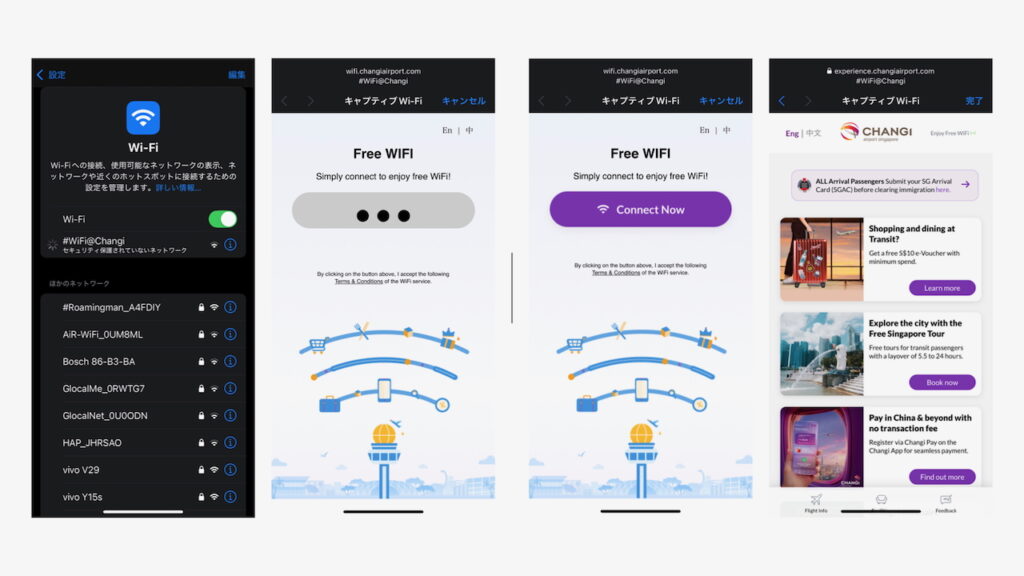 チャンギ空港の無料Wi-Fi「#WiFi@Changi」に接続する手順を解説します。SSID(ネットワーク名)は「#WiFi@Changi」です。空港内でWi-Fiをオンにすると、このSSIDが表示されるはずです。以下のような流れで接続しましょう。